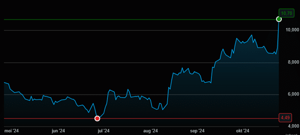 HelloFresh: Afgelopen vrijdag steeg de koers met bijna 20% nadat het bedrijf aankondigde dat de aangepaste EBITDA voor Q3 2024 ruim boven de marktverwachtingen ligt. Met deze stijging hebben we in slechts een paar maanden tijd een winst van bijna 100% gerealiseerd.